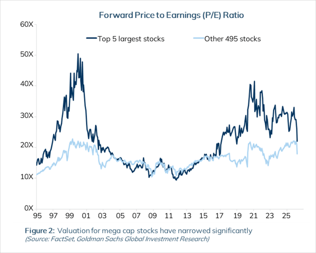 For example, Microsoft’s recent 35% decline from its previous highs has given us an opportunity to become shareholders in the company once again. Figure 2 illustrates this dynamic well. Within the S&P500, the valuation premium of the top 5 largest stocks by market capitalization has recently narrowed significantly.
